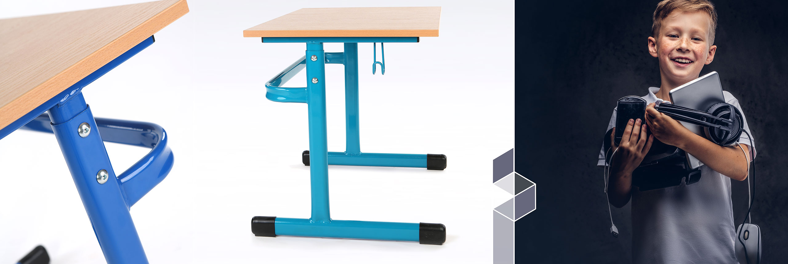Blaty wykonane z materiałów najwyższej jakości charakteryzują się odpornością na intensywne użytkowanie, zarysowania i działanie płynów. Zaokrąglone krawędzie eliminują ryzyko urazów, a stabilna konstrukcja zapewnia bezpieczeństwo nawet przy dynamicznym użytkowaniu, charakterystycznym dla środowiska szkolnego.